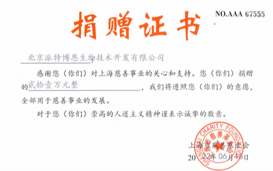 2022年6月,北京派特博恩生物技術(shù)開發(fā)有限公司(派特生物)再次向蒲公英漸凍人關(guān)愛中心捐贈(zèng)善款21萬元,用于派特生物關(guān)愛漸凍人公益項(xiàng)目——其中用于漸凍人生命支持設(shè)備減負(fù)項(xiàng)目為15萬元,用于漸凍人護(hù)理慰問禮包發(fā)放活動(dòng)為6萬元。
