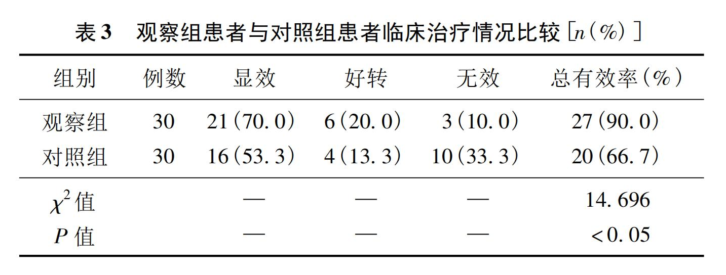 觀察組治療后有27例患者顯示有效,占90.0%,顯著高于對照組的66.7%,差異具有統(tǒng)計學意義(P<0.05)。